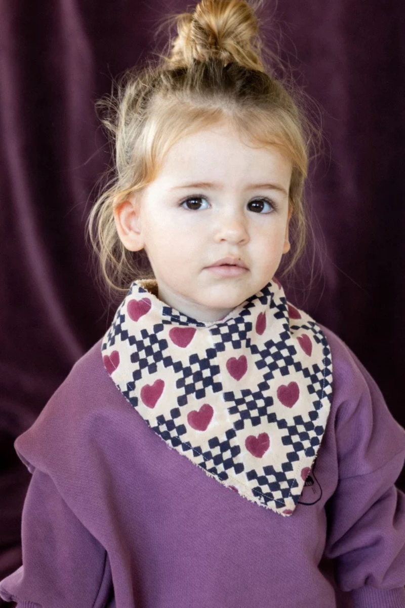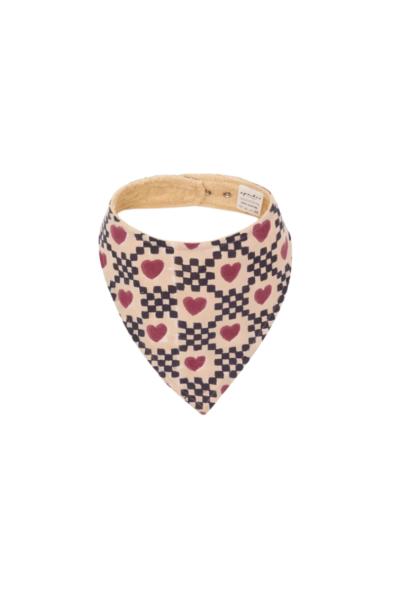 Adorable bavoir de la marque Apaches, bavoir Bami avec un joli motif "coeur" coloris macadamia. Un bavoir à mi-chemin entre un foulard et un bavoir. Conçu avec un côté éponge absorbant, il est à la fois élégant et pratique.