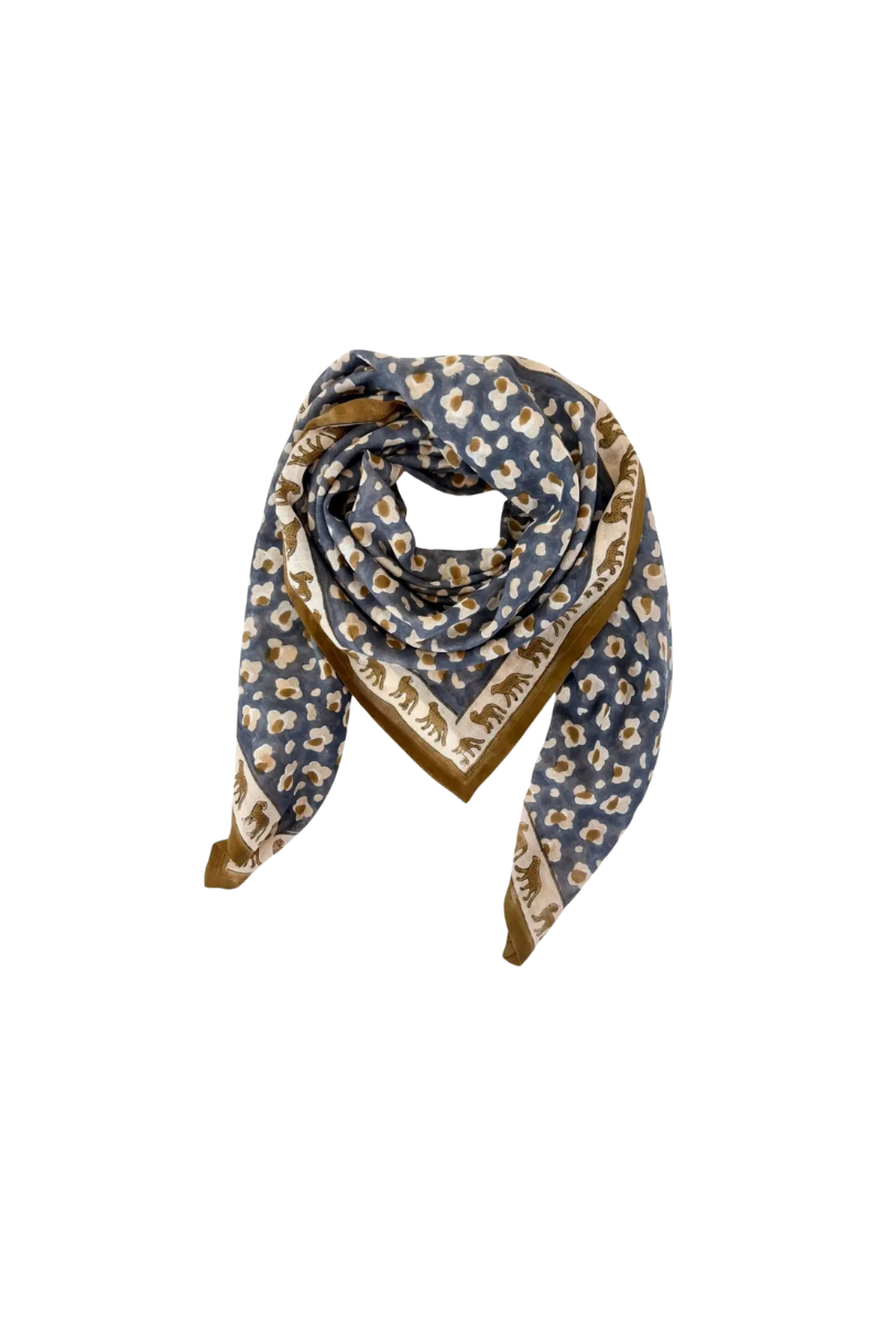 Découvrez l'édition Apaches "Felinda" en version météorite. Chaque foulard est fabriqué à partir de voile de coton tout doux. Le voile de coton offre à ce foulard un aspect vaporeux, légèrement transparent. On aime beaucoup ce motif léopard sur un fond bleu grisé.
