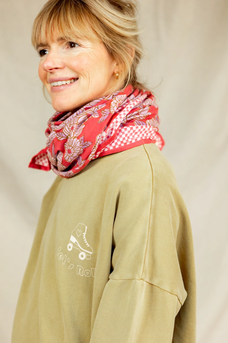 En 100% coton, chaque foulard est confectionné artisanalement grâce à la technique indienne du block-print, ses couleurs sont réalisées à partir de pigments naturels. Cette confection manuelle peut entraîner certaines "irrégularités".