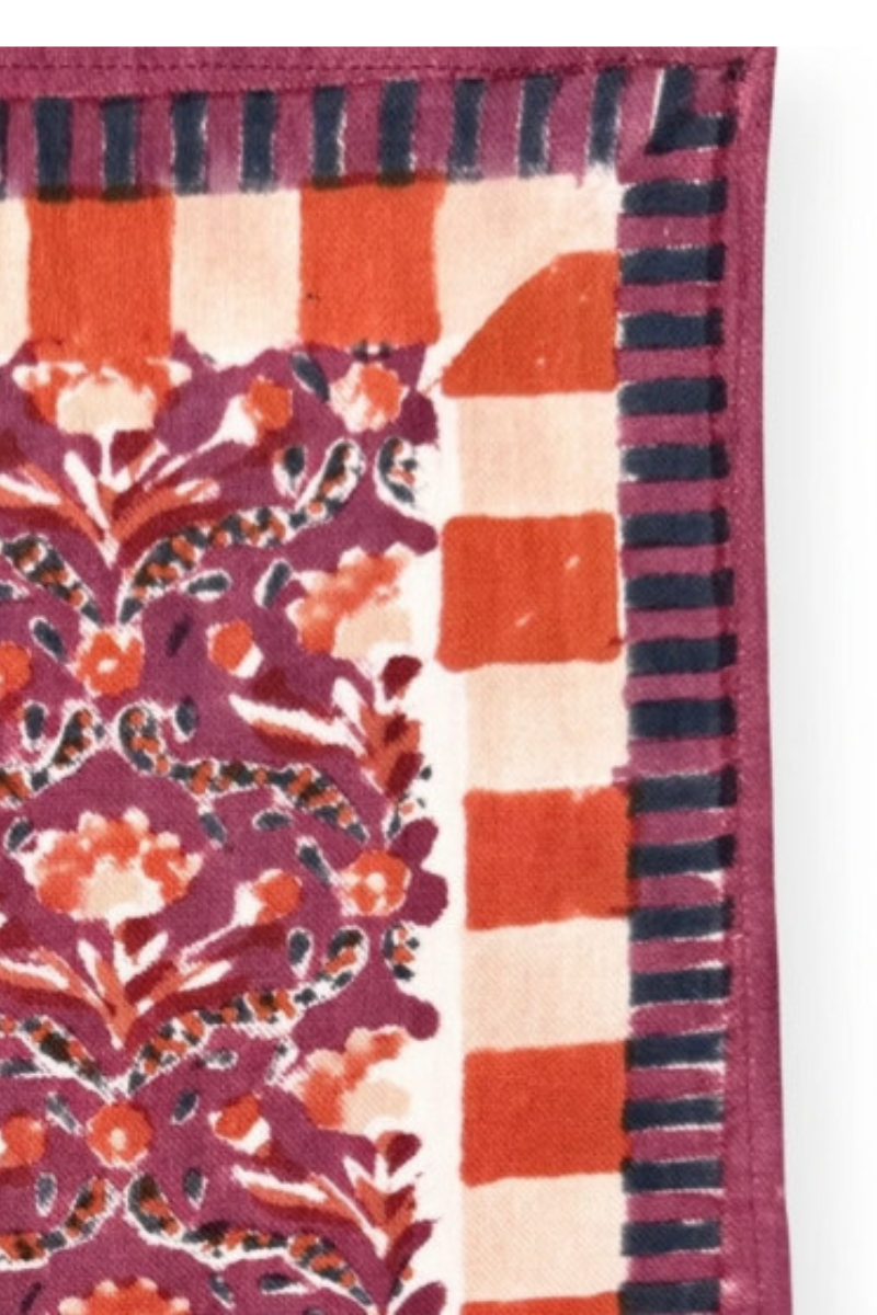 En 100% coton, chaque foulard est confectionné artisanalement grâce à la technique indienne du block-print, ses couleurs sont réalisées à partir de pigments naturels. Cette confection manuelle peut entraîner certaines "irrégularités".