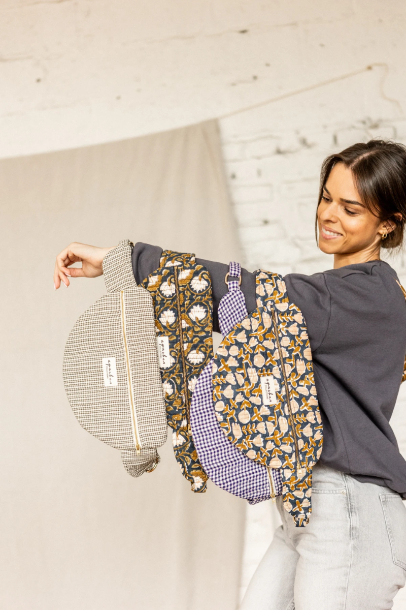 Découvrez ce sac banane Keli Apaches en coton, dans sa version maxi, imprimé "Tulipe" orage. Pratique pour ranger vos affaires essentielles du quotidien, téléphone, clés, à emporter facilement avec vous.