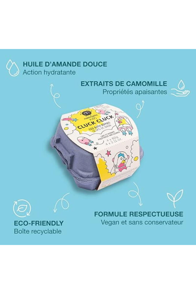 Place à une chasse aux œufs sans chocolat, mais pleine de surprises ! Le coffret "Cluck-Cluck" de Nailmatic contient 4 boules de bain effervescentes en forme d’œufs, pour des moments joyeux et colorés dès 3 ans.