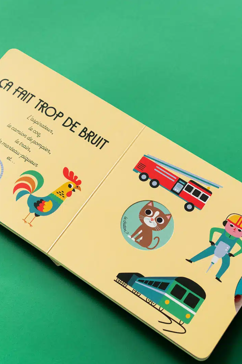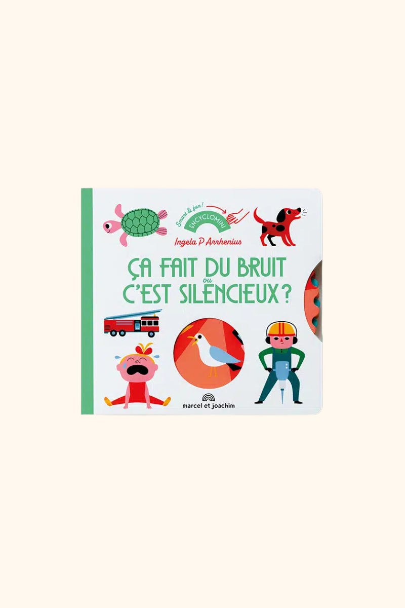 Un livre interactif drôle et coloré pour découvrir le monde des bruits ! Grâce à ses roues à tourner, l’enfant peut choisir s’il pense qu’un objet fait du bruit ou non. Une façon amusante d’apprendre les contraires, d’enrichir son vocabulaire et de développer sa motricité fine tout en s’amusant.