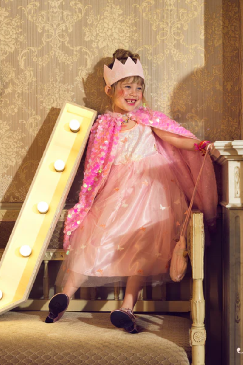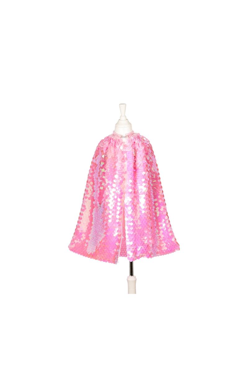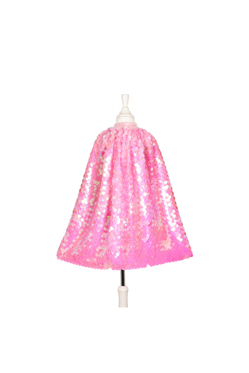 Cette cape est confectionnée en tulle rose délicat, entièrement recouvert de grands sequins scintillants qui captent la lumière à chaque mouvement, créant un effet magique et étincelant. Le col en satin soyeux ajoute une touche d'élégance supplémentaire, tandis que la fermeture par boutons nacrés à l'avant assure un maintien sûr et confortable.