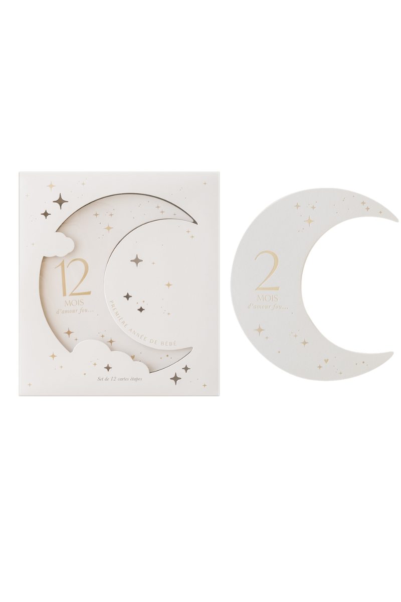 Immortalisez la première année de votre bébé avec le coffret de cartes étapes Moon. Composé de 12 cartes étapes au design poétique, ce coffret vous permettra de prendre de superbes photos souvenirs et d’annoter au dos l’évolution de bébé mois après mois ! Un pochon en coton est également fourni pour conserver précieusement les jolies cartes.