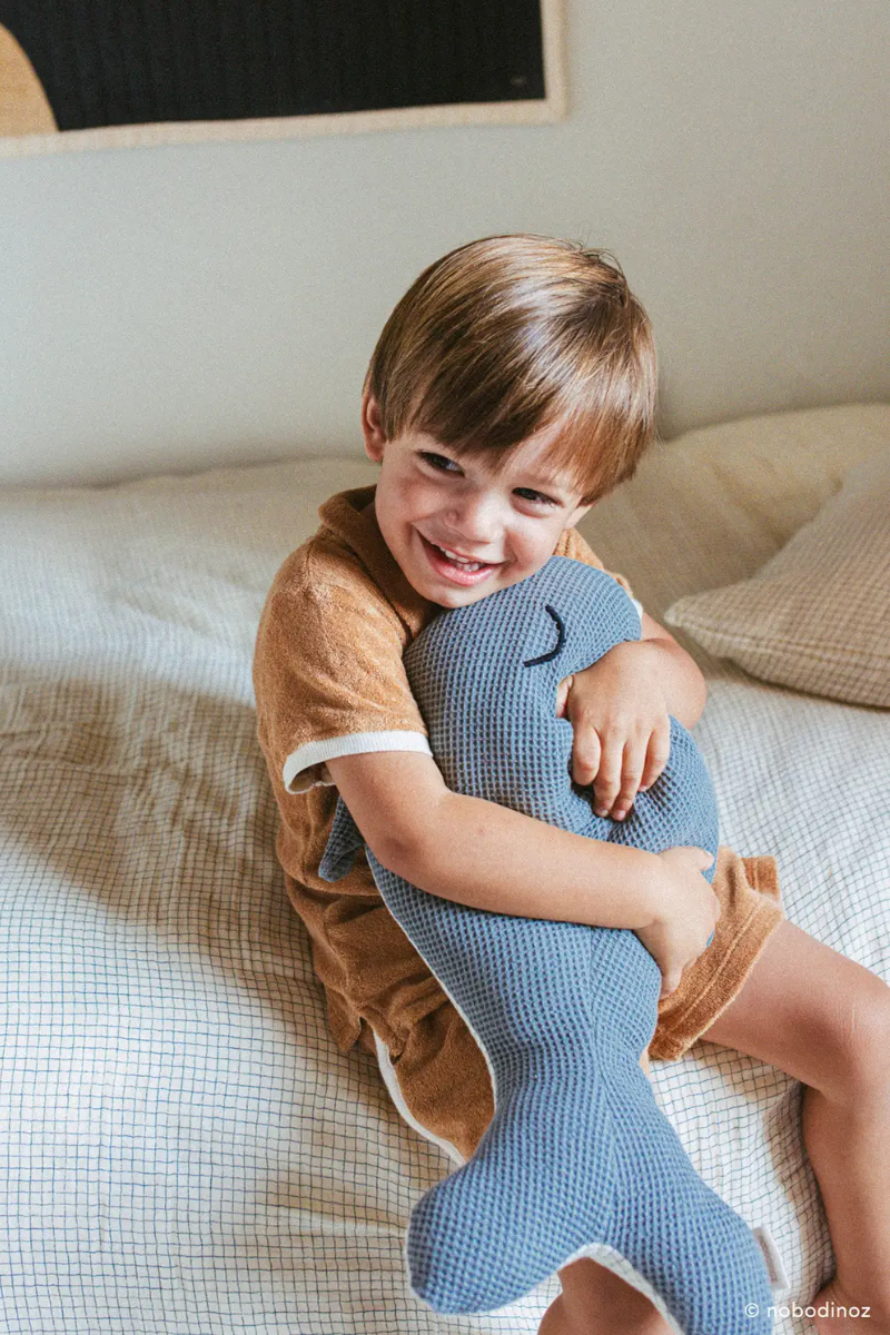Prêt à plonger dans un océan d'aventures aux côtés de votre enfant, le coussin baleine de chez Nobodinoz est le compagnon idéal.