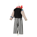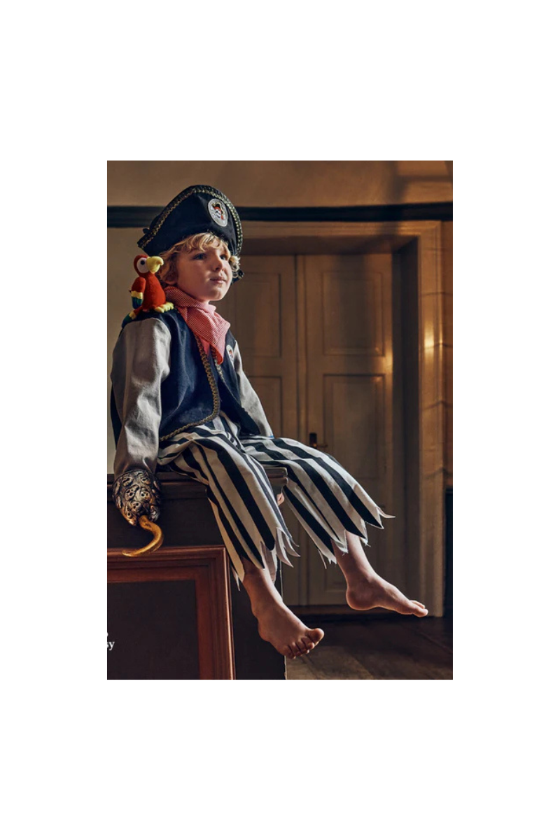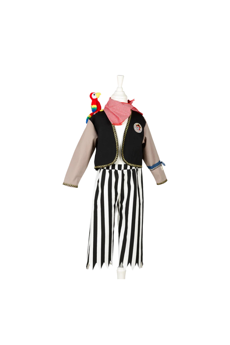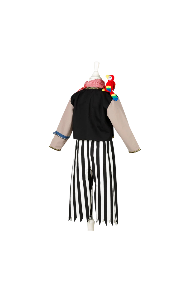 Il se compose d’un haut avec gilet noir cousu, de manches longues beiges, et d’un pantalon rayé noir et blanc à la coupe irrégulière. Le déguisement est complété par un foulard rouge à carreaux et un perroquet coloré en peluche accroché à l’épaule, pour un effet pirate réussi.