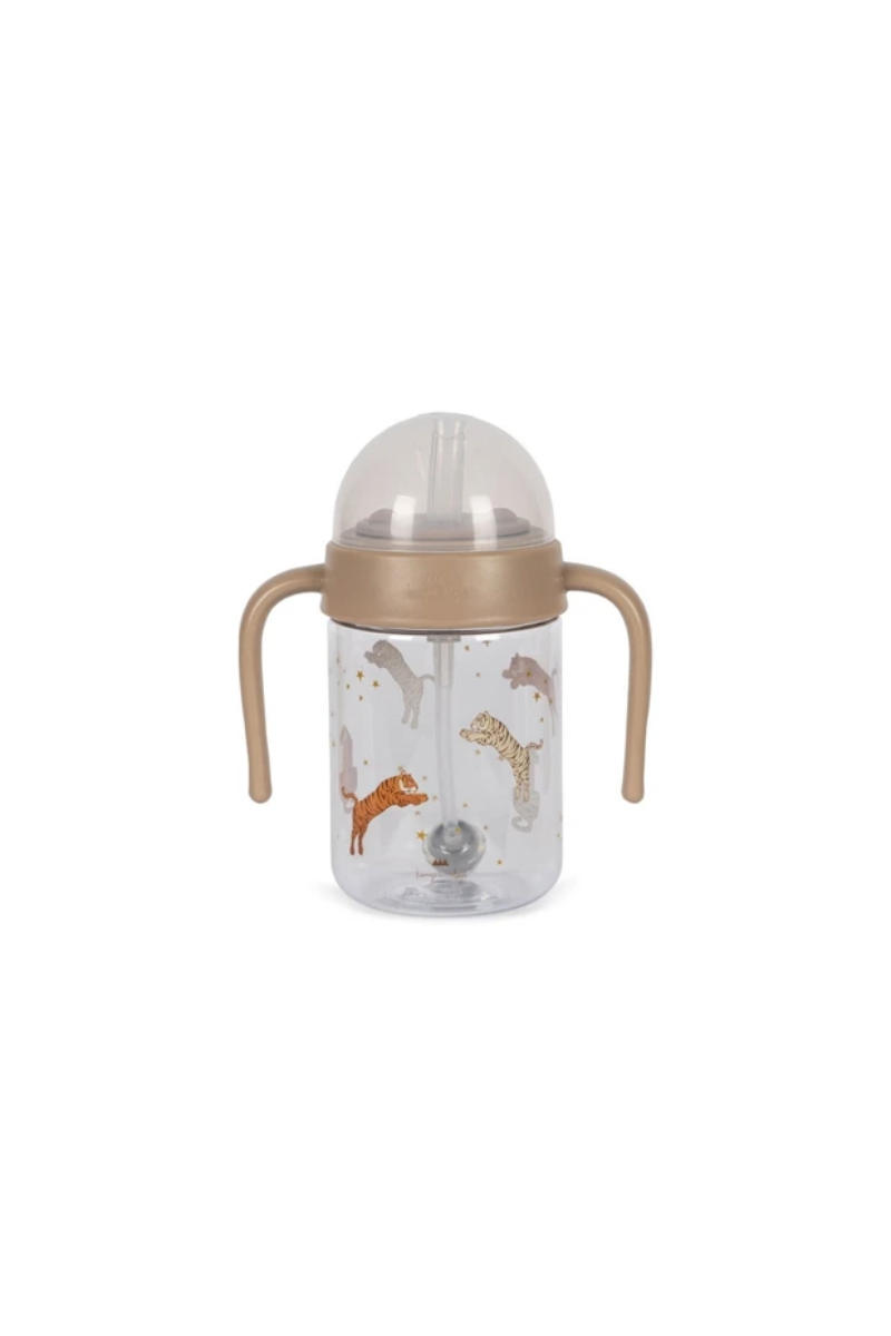 Gourde à paille lestée avec capuchon et anses amovibles de Konges. Cette jolie gourde est transparente à motif tigres.