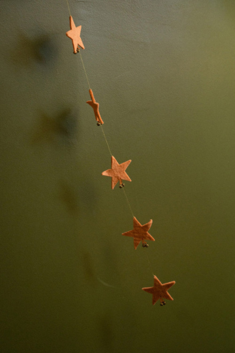 Six petites étoiles filantes comme suspendues dans le ciel, des petits grelots qui tintent dans la nuit, voilà de quoi faire le plus doux des rêves. Réalisée à la main par les artisanes népalaises de la marque Muskhane, cette guirlande de feutre coloris naturel qui mesure 140 cm, insufflera un peu de poésie dans la chambre de votre enfant.