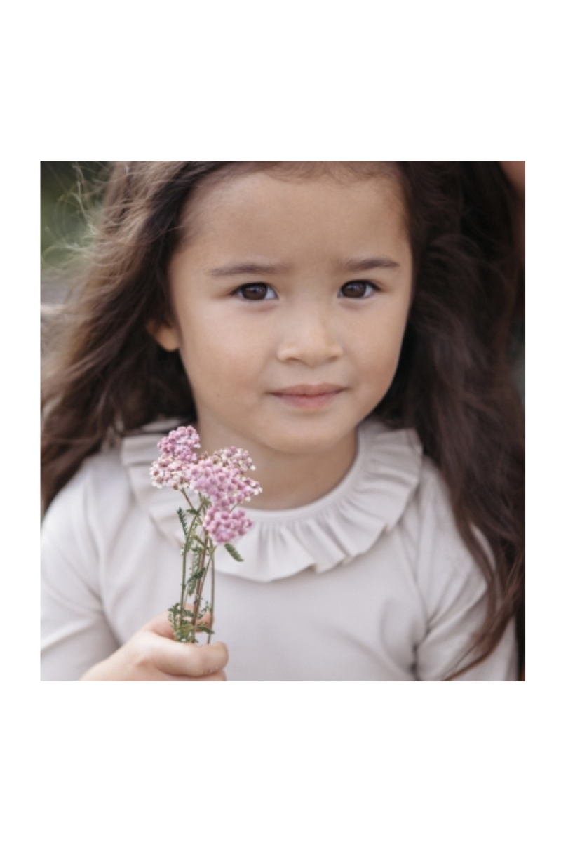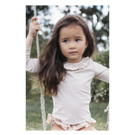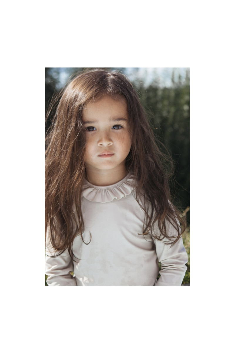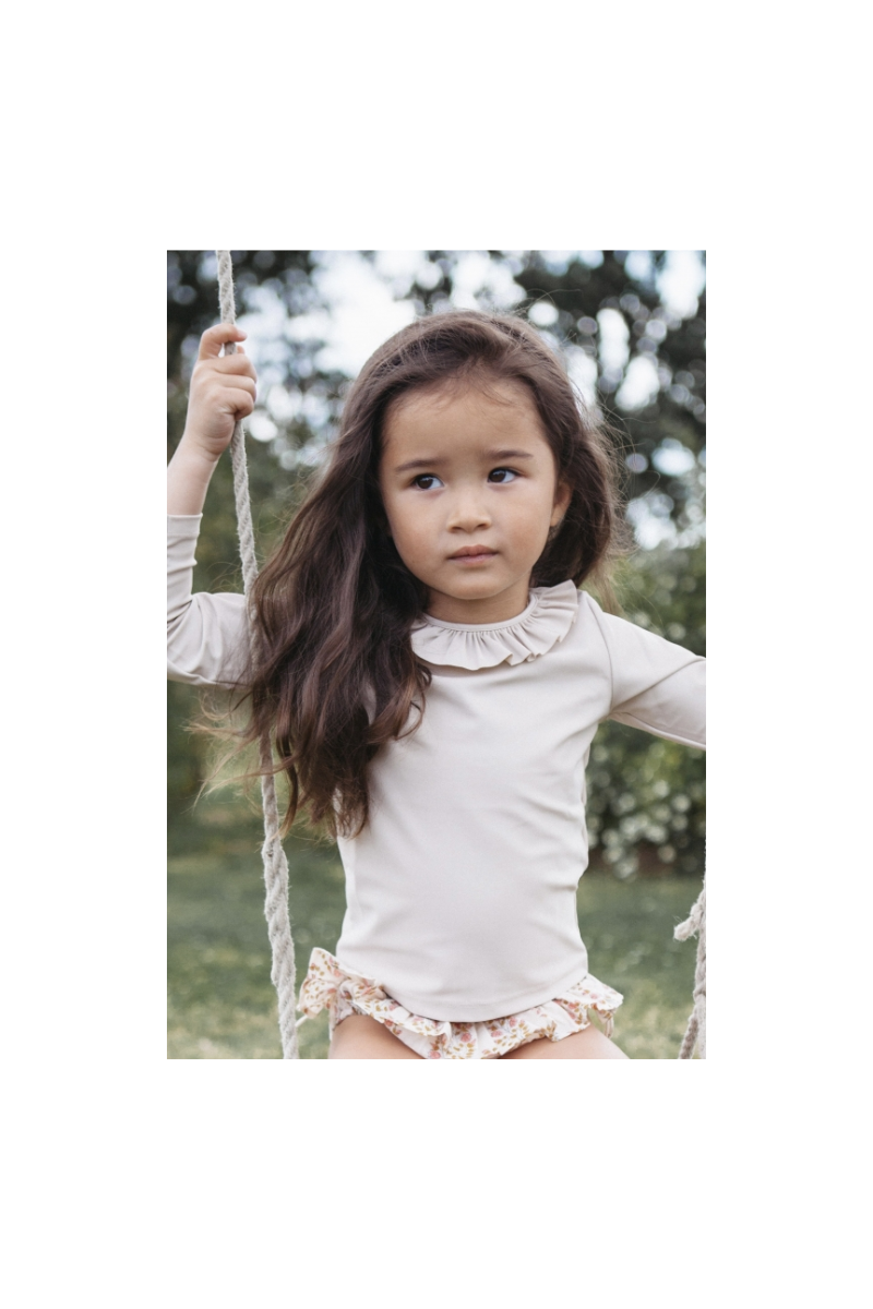 Le haut de maillot "Joe" écru protège avec style les petites épaules grâce à sa matière anti-UV. On aime son col à volants, délicatement froncé, qui apporte une touche élégante tout en restant pratique pour jouer, courir et se baigner .