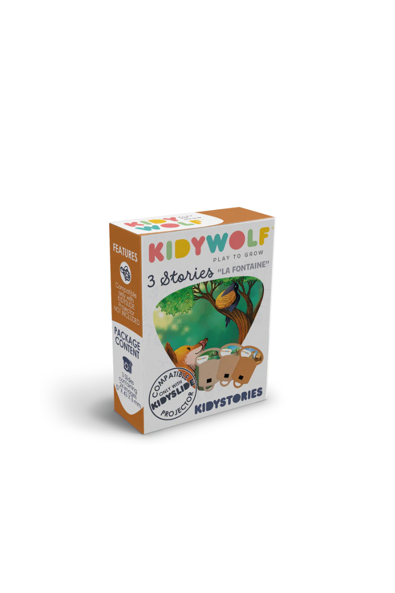 Trio d’histoires sur le thème de La Fontaine, conçu pour être utilisé avec la torche à histoires Kidyslide coloris bleu ou rouge. Chaque set d’histoires transporte les enfants dans un monde d'imagination et d’aventure, où ils peuvent rêver, apprendre et développer leur créativité.