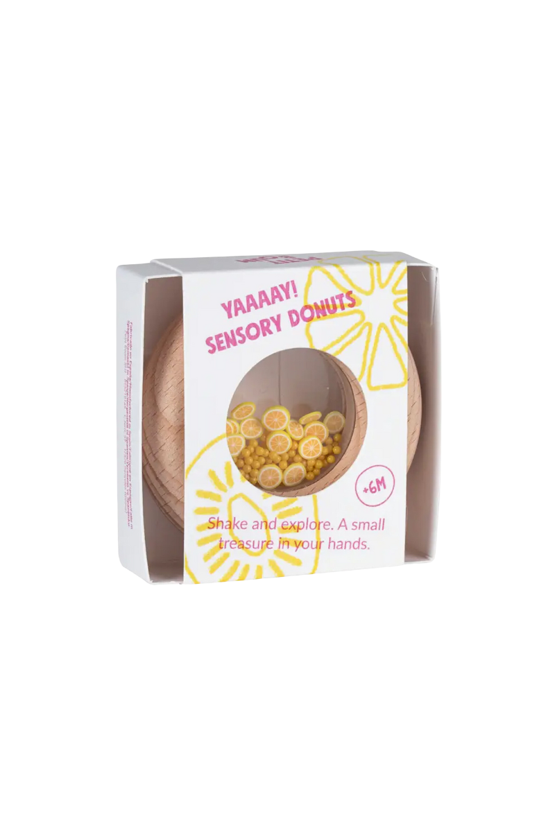 Un hochet sensoriel en forme de donut, facile à attraper, qui invite bébé à observer, secouer et écouter. À l’intérieur, des billes citron accompagnées de petits citrons s’animent à chaque mouvement, attirant le regard et éveillant la curiosité.