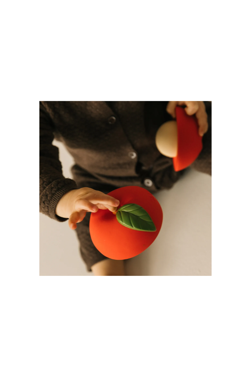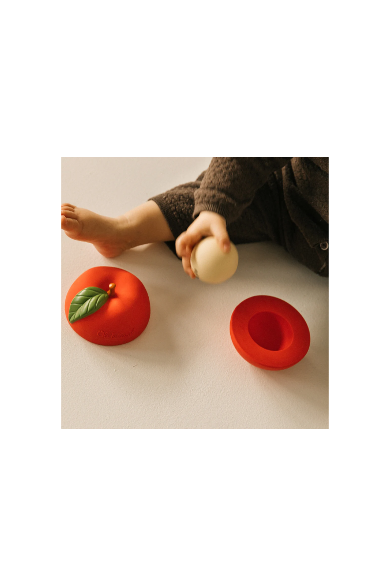 "Pepa the Apple" de Oli&Carol est un jouet 3 en 1 en forme de pomme : empilable , balle sonore et balle rebondissante . Fabriqué à la main en caoutchouc 100 % naturel issu d'arbres Hévéa, ce jouet unique stimule la motricité, la coordination et la curiosité de bébé dès 9 mois . À l'intérieur, une petite boule remplie de noyaux de cerise recyclés émet un doux grelot qui éveille l'ouïe tout en apaisant.