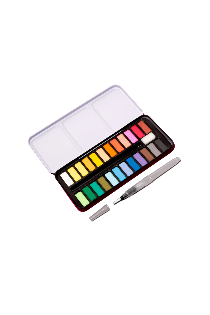 Facile à transporter et à utiliser, la boîte Omy est dotée de 24 couleurs vives et lumineuses, d’une éponge et d’un pinceau à réservoir d’eau pour encore plus de praticité.