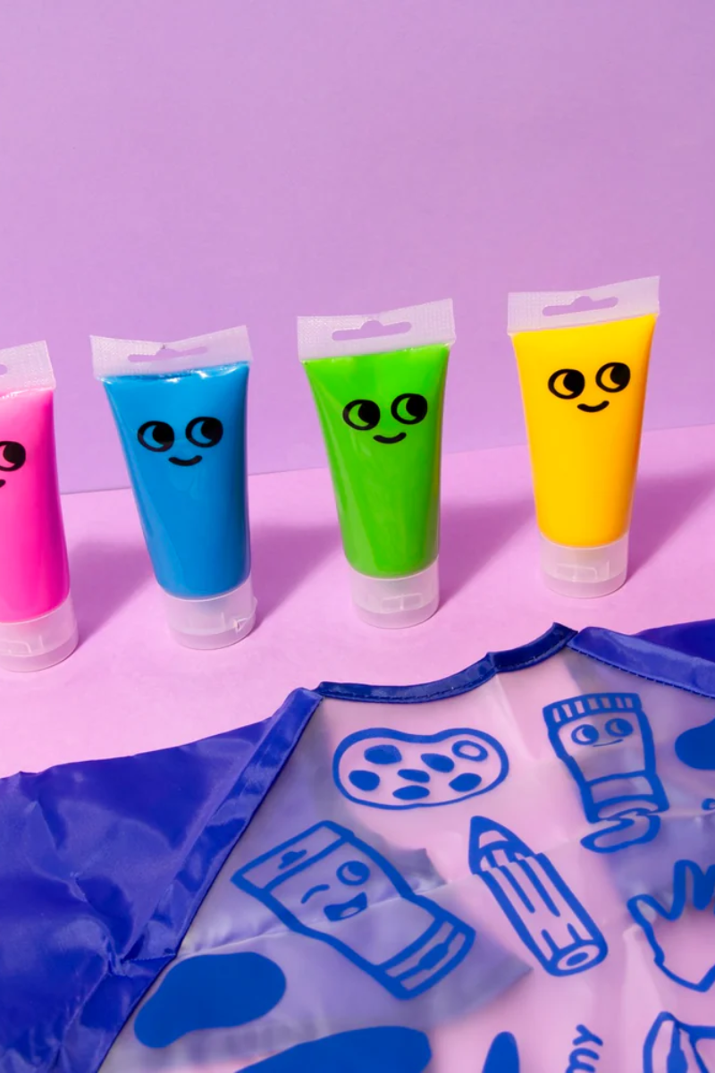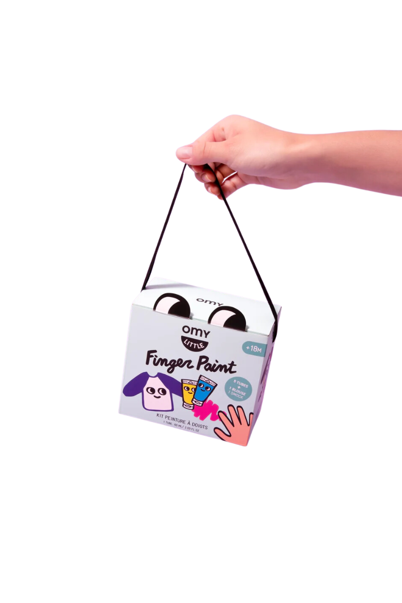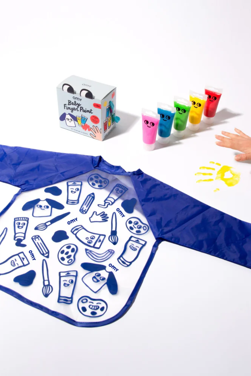 Le kit de peinture à doigts de la marque Omy se compose de 5 tubes de peinture à l’eau de 60 ml (bleu, vert, jaune, rouge et rose) ainsi que d'un tablier.