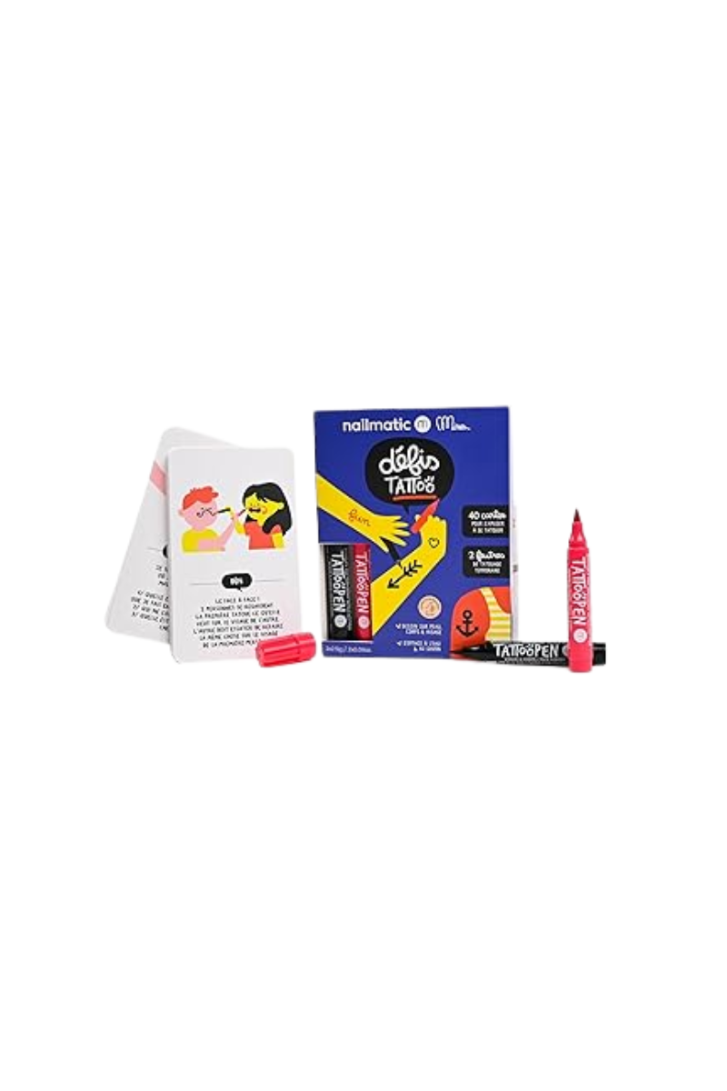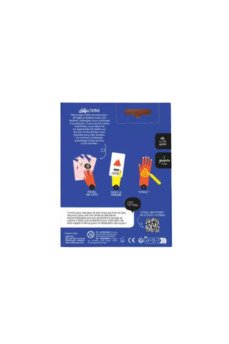 Ce coffret contient 40 cartes de défis à piocher, toutes plus fun les unes que les autres : inventer un tatouage collectif, faire deviner une expression, répondre à des quiz en se faisant tatouer à chaque mauvaise réponse… Une belle occasion de se retrouver loin des écrans, feutres en main !