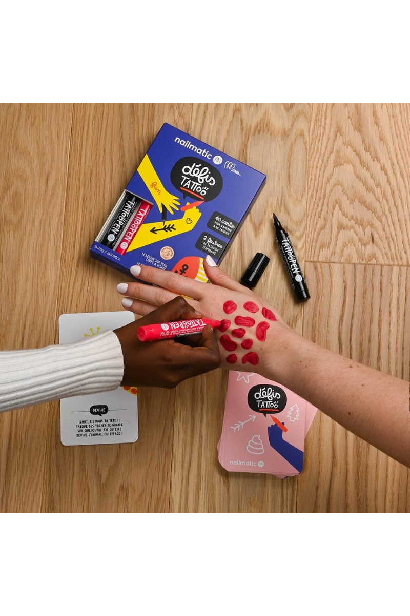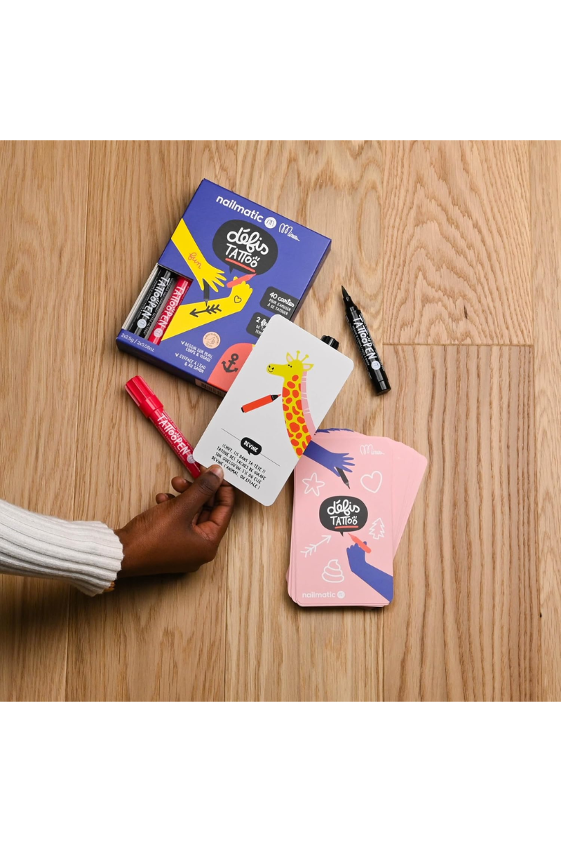 Contenu du kit : 40 cartes défis à découper (format 8x14 cm), 1 feutre Tattoopen rouge et 1 feutre Tattoopen noir