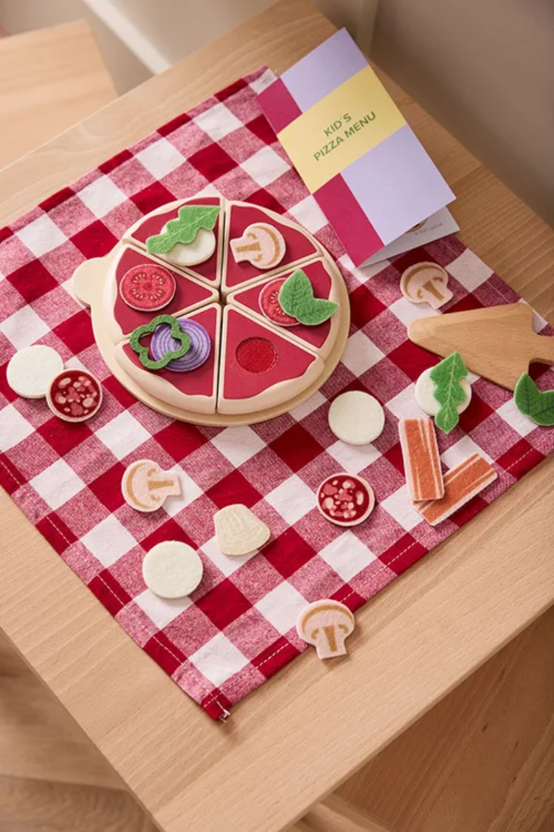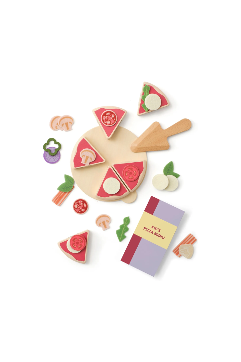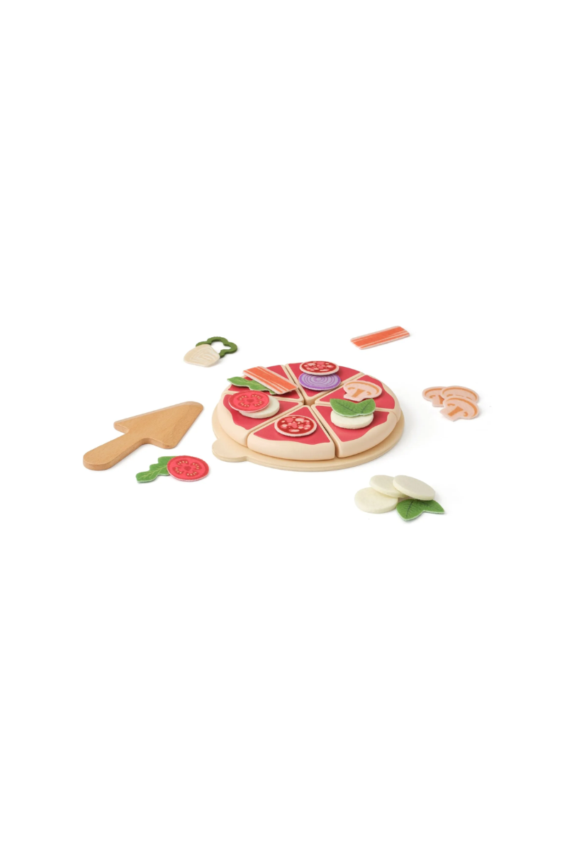 Régalez-vous et amusez-vous à préparer vos pizzas avec ce kit pizza en bois ! Il contient une pizza en six parts avec attaches velcro, 22 ingrédients en feutre, comme des tomates, salami, roquette, poivron vert, champignons, et autres. Ainsi qu'une pelle, un plateau et un menu.