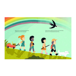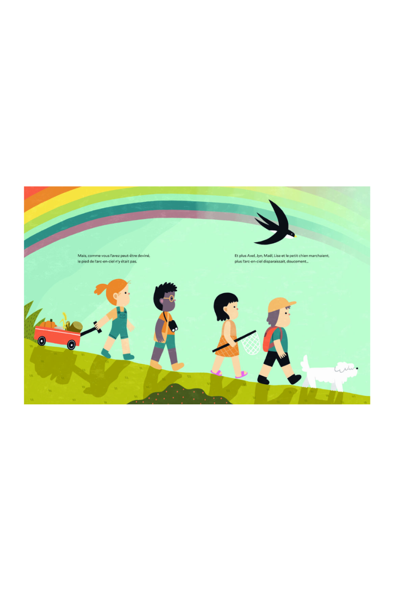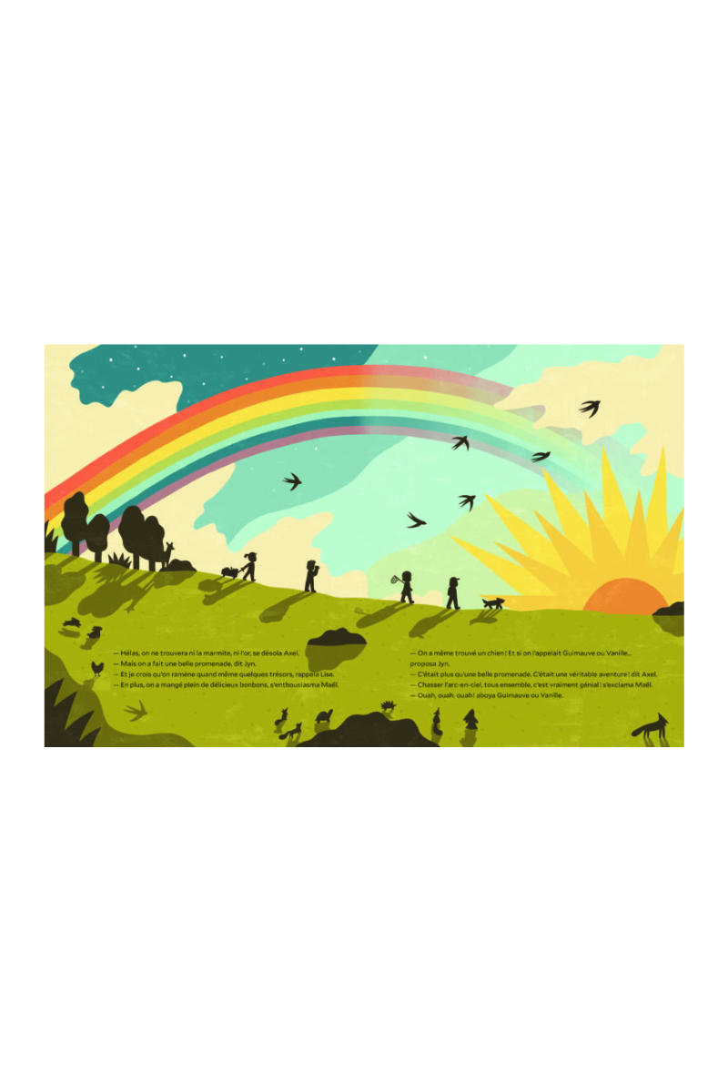 On raconte qu’un trésor se cache au pied des arcs-en-ciel… Quatre enfants, un filet à papillons, quelques bonbons et une envie d’aventure suffisent à les lancer sur la piste.