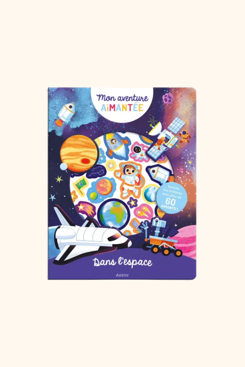 Avec “Dans l’espace”, les enfants embarquent pour une aventure intergalactique ! Au recto, ils prennent les commandes d’une navette spatiale, et au verso, ils explorent les étoiles, planètes et astéroïdes de la voie lactée. Grâce aux 60 aimants à positionner librement, ils peuvent inventer leurs propres missions spatiales.