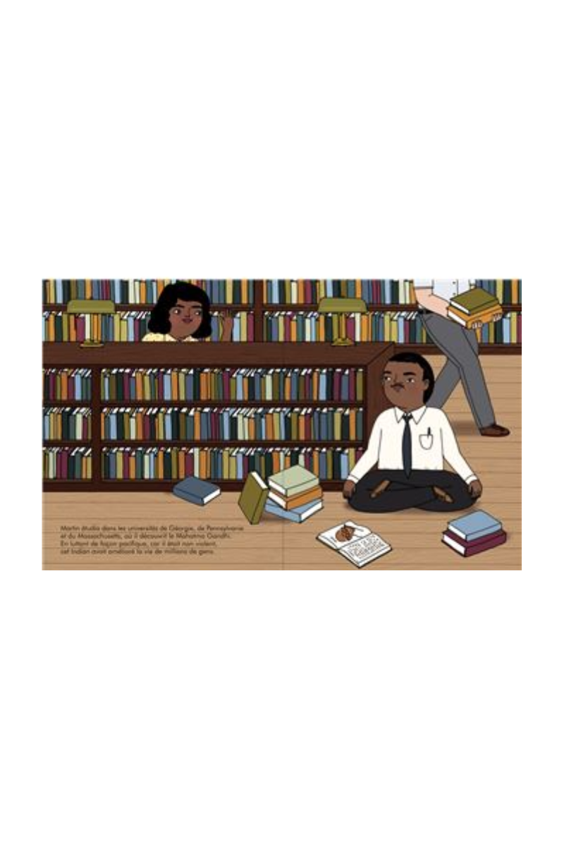 Découvre comment le petit Martin, devenu très jeune un pasteur hors du commun, est devenu un militant emblématique de la non-violence. Toute sa vie, il a lutté pour l’égalité entre les Noirs et les Blancs, en défendant les droits des Afro-Américains avec courage, foi et détermination, jusqu’à devenir un symbole mondial de paix et de justice.