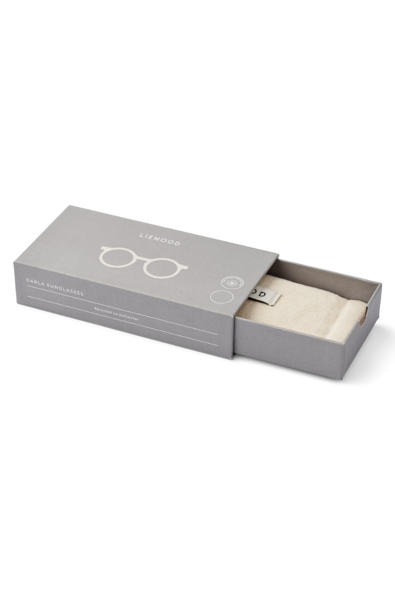 Protégez du soleil les petits yeux de vos enfants avec les lunettes de soleil rondes Darla de la marque Liewood. Les lunettes de soleil sont de catégorie 3 avec verre de protection UV400. Elles sont dotées d’un cadre léger en polycarbonate recyclé durable, avec des charnières à ressort ajoutées pour éviter toute casse. Taille 1-3 ans.