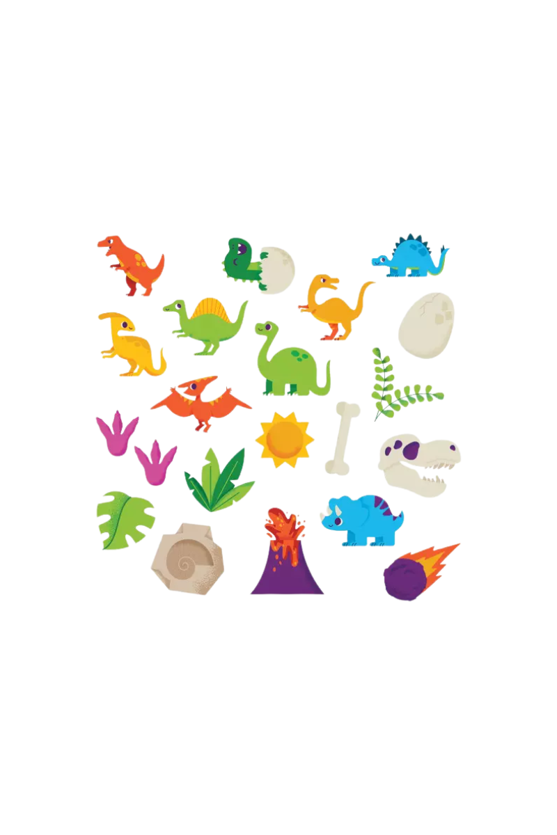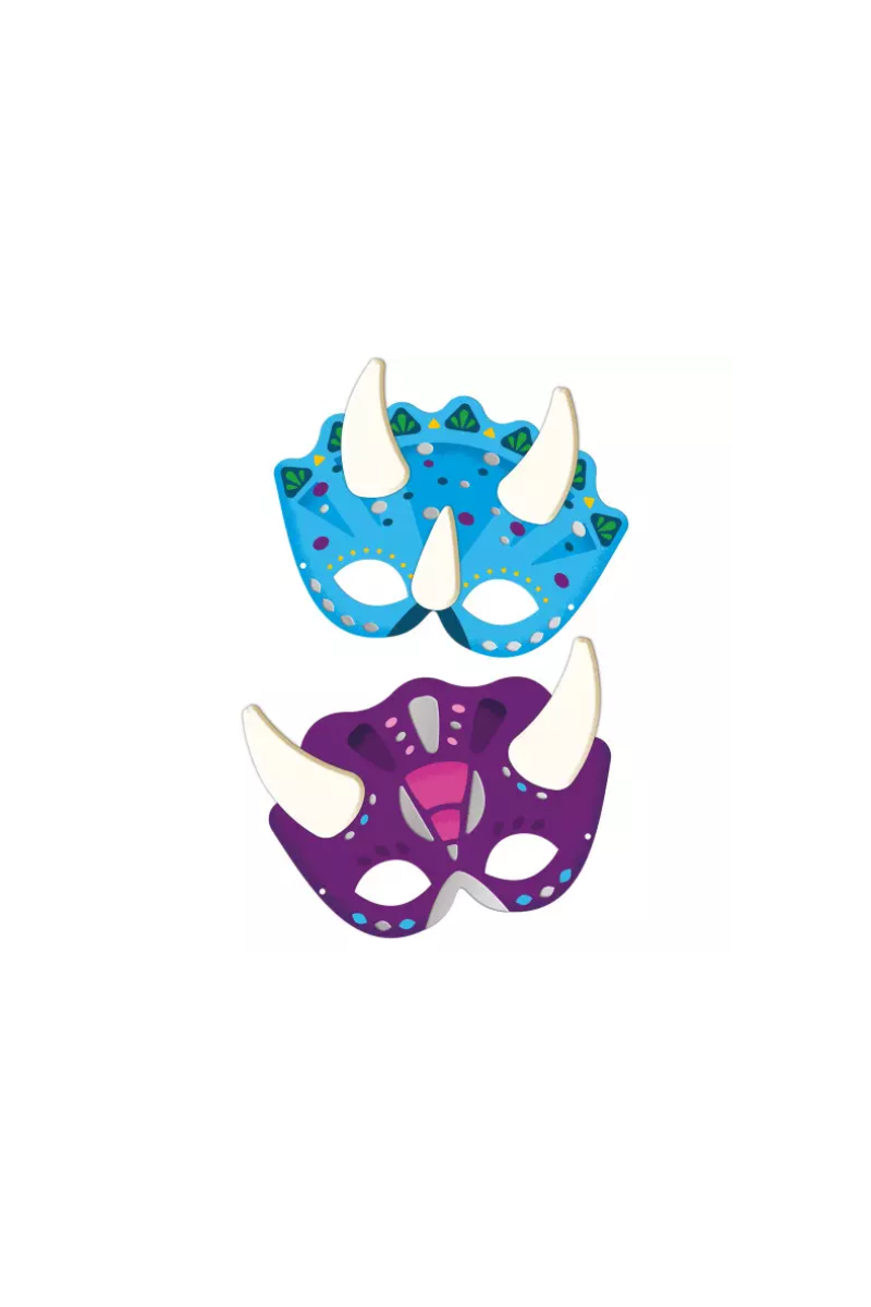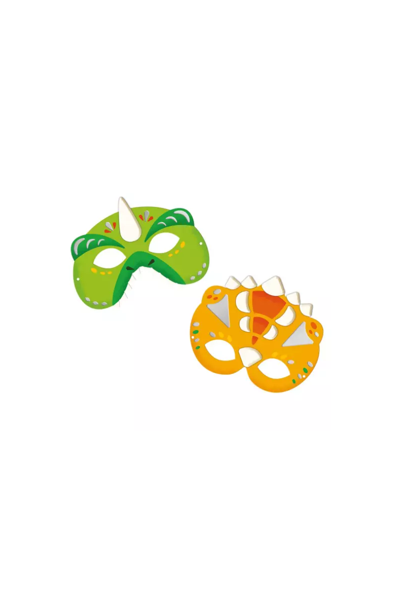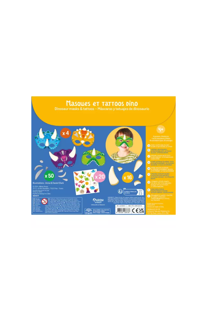 La pochette contient 4 masques en carton épais à personnaliser avec des autocollants en mousse et des autocollants brillants, pour créer des déguisements uniques et colorés. En bonus, 20 tatouages dinosaures à poser sur la peau pour compléter le look comme un vrai petit aventurier (ou aventurière) préhistorique !