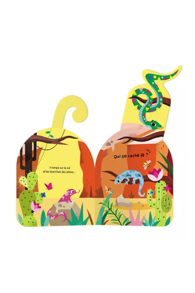 Des queues d’animaux dépassent des pages… Qui se cache derrière ? Tire pour révéler l’animal, écouter son cri et finir sur une surprise rigolote avec une grenouille la tête en haut !