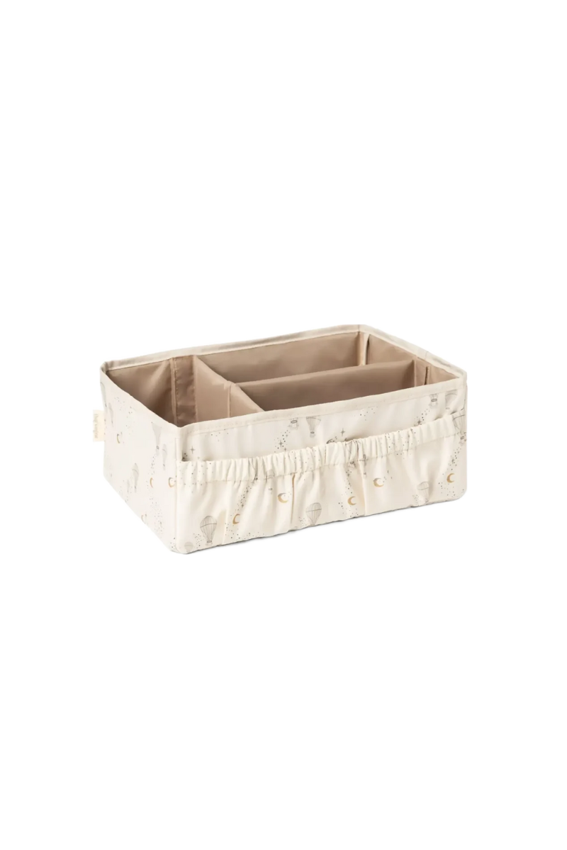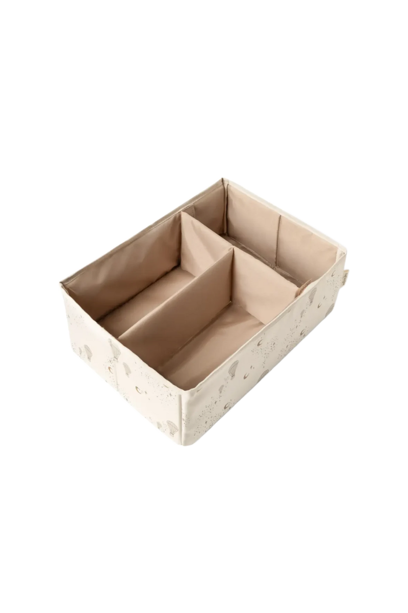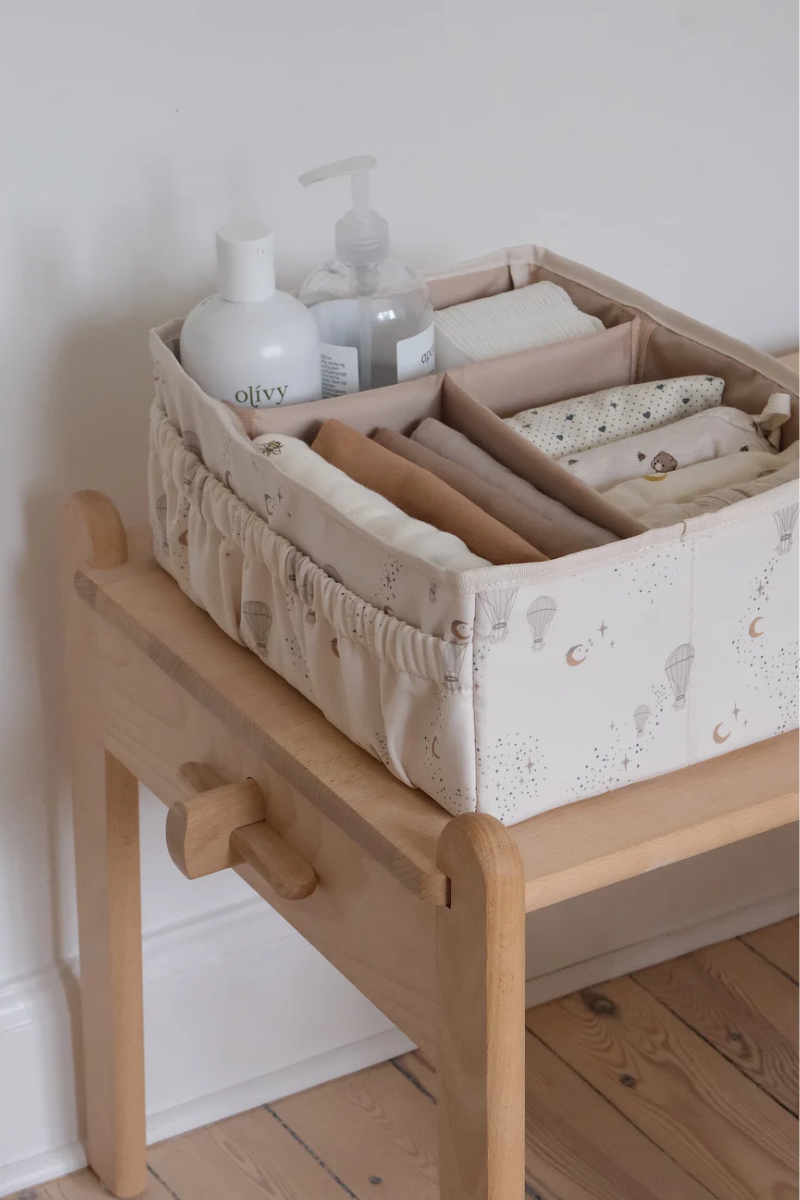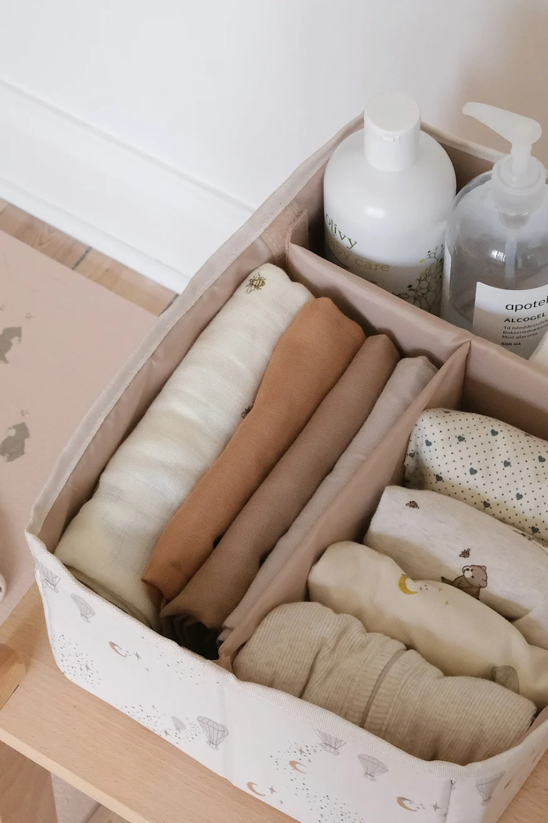 Cet organisateur est parfait pour garder tous les essentiels de votre bébé bien rangés et à portée de main. Il dispose de plusieurs compartiments et poches pour tout stocker, des couches et lingettes aux jouets et biberons. Il dispose d'un grand compartiment avec des séparateurs amovibles qui peuvent être ajustés grâce à une fermeture velcro : vous pouvez choisir d'avoir un grand compartiment ou de le diviser en trois petits compartiments.