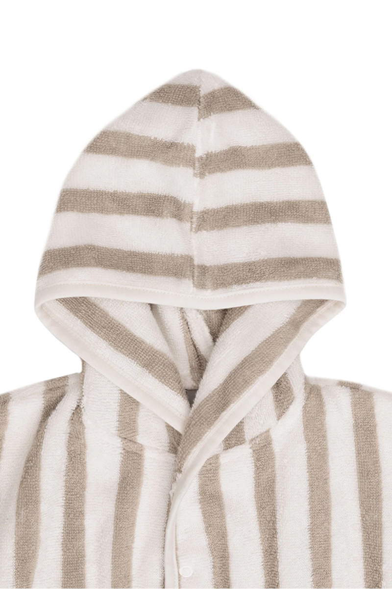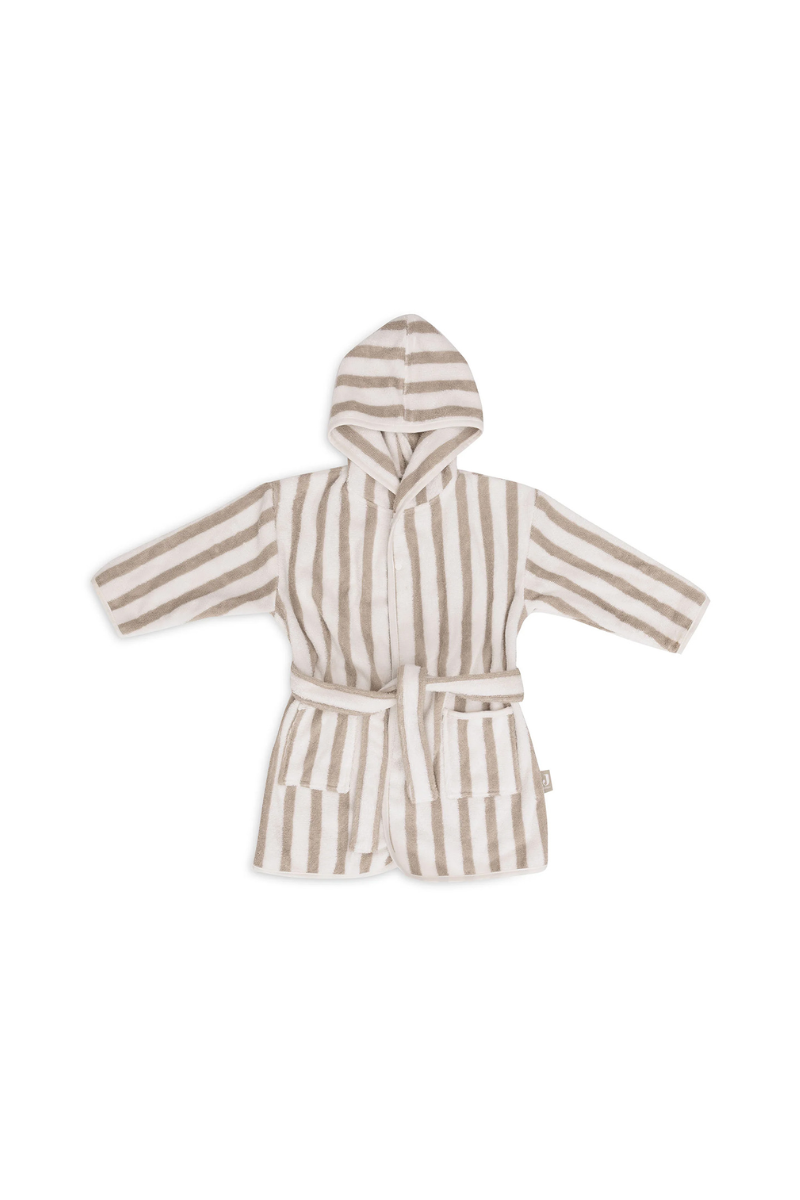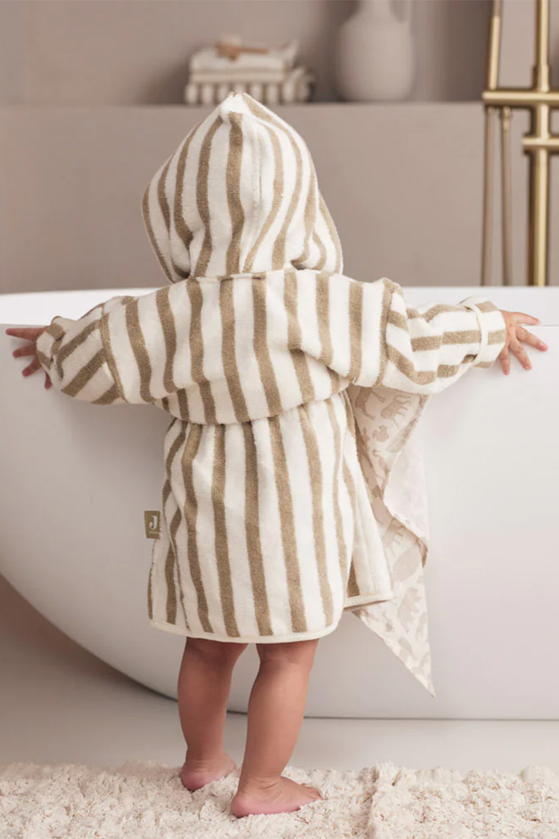 Joli peignoir rayé en éponge de chez Jollein qui est non seulement doux, mais aussi respectueux de l'environnement grâce à sa certification GOTS.