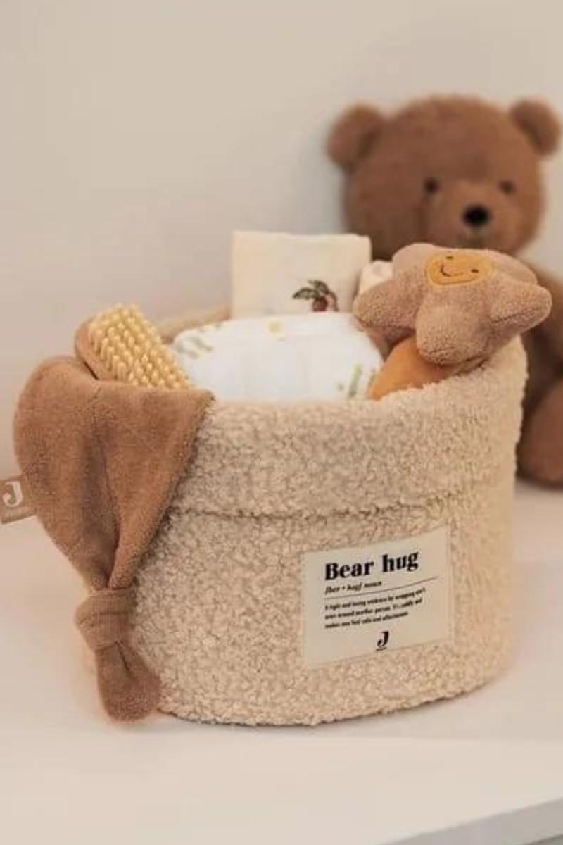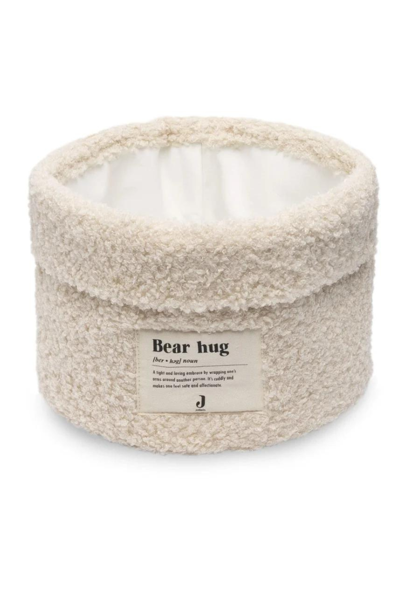 Ce panier de rangement pratique en tissu bouclette doux de Jollein est parfait pour ranger des objets. Sur le devant du panier se trouve l'adorable logo "bear-hug".