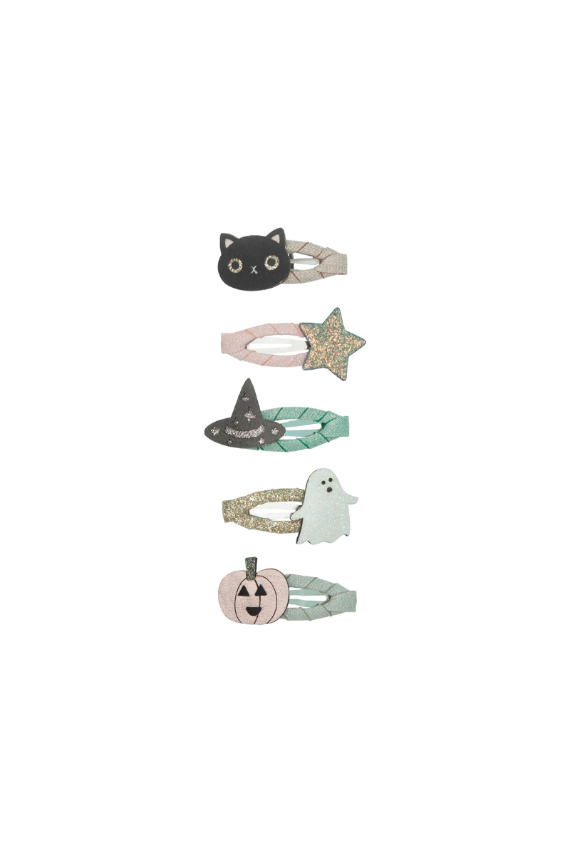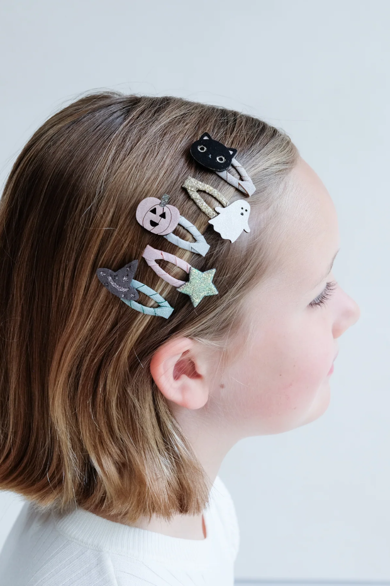 On craque pour cette collection spéciale Halloween avec ce lot de 5 pinces à cheveux de la marque Mimi & Lula : une jolie citrouille, une étoile qui brille, un fantôme avec sa pince dorée, un chat tout noir et un chapeau de sorcière.