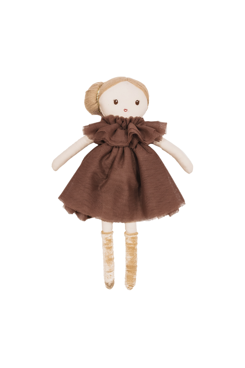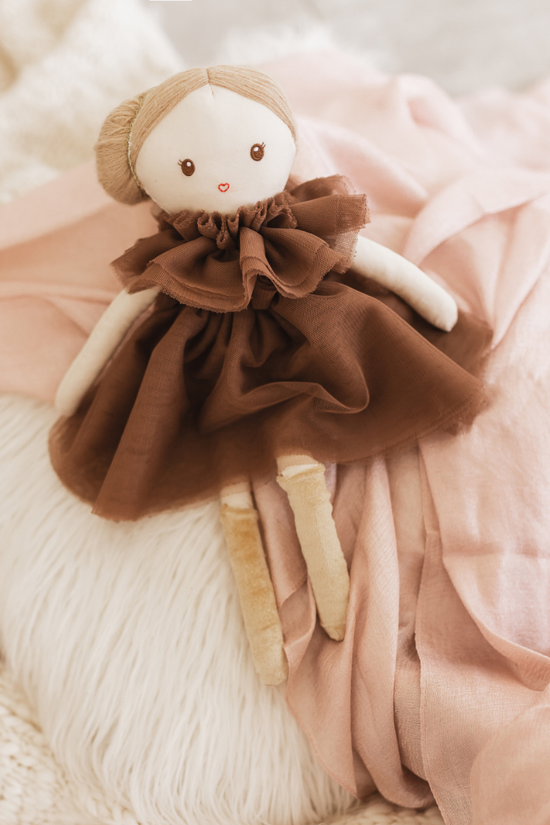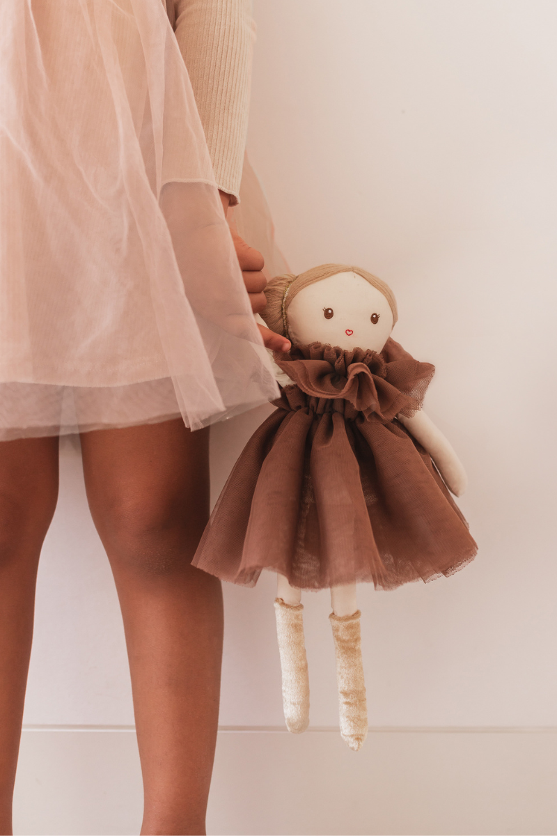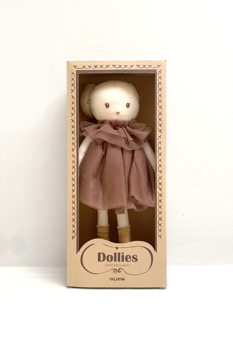 Découvrez cette jolie poupée de la marque Mrs Ertha fabriquée à la main à partir de 100% coton. Les vêtements sont en tulle et peuvent être retirés de la poupée, ainsi que les chaussettes et le short intérieur. On adore les détails raffinés tels que son élastique brillant dans les cheveux.