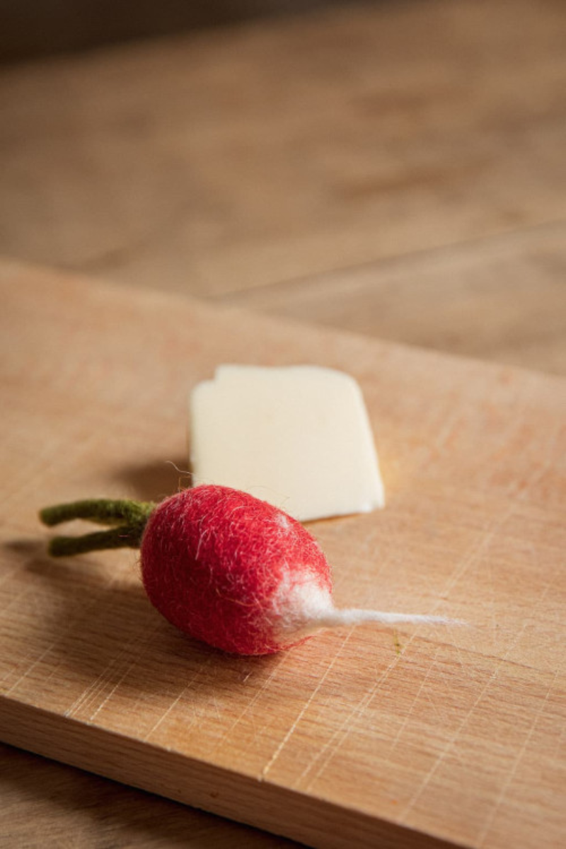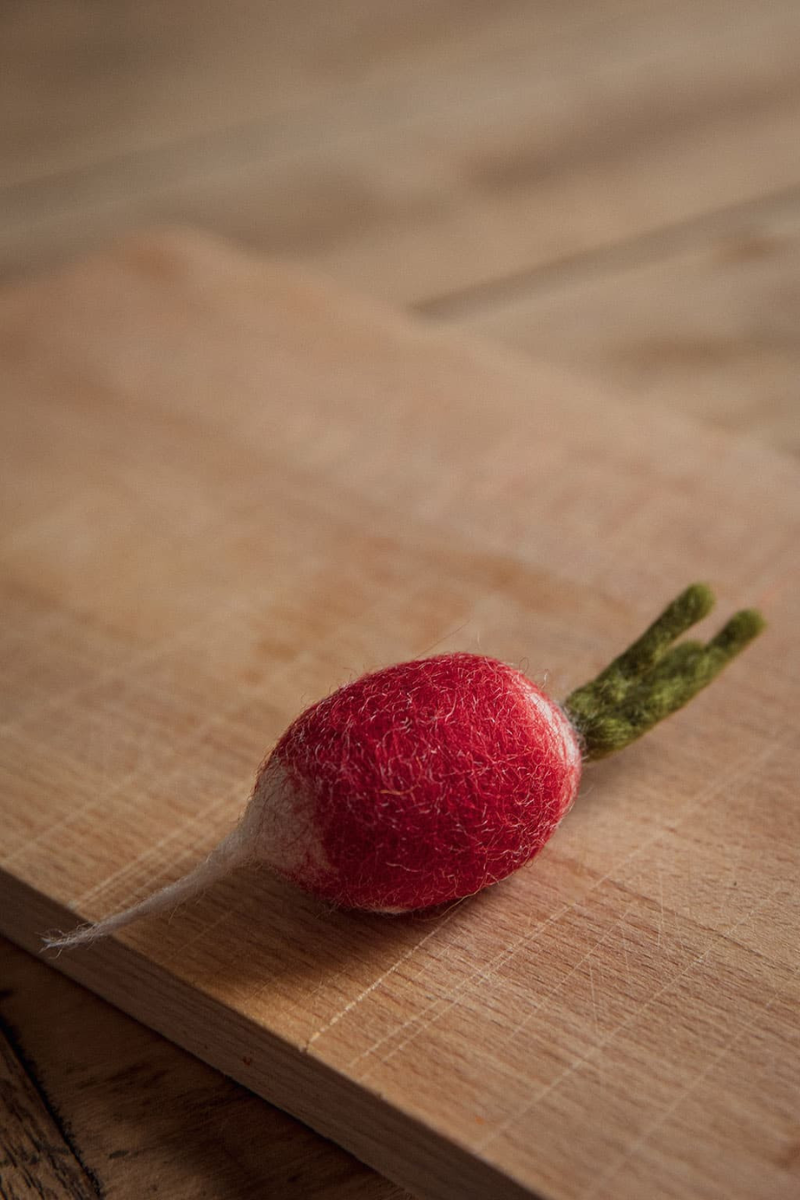 Intégralement confectionné en feutre de laine par nos artisans au Népal, il figure avec poésie son double fraîchement cueilli. Le corps charnu d’un rose intense, les fanes coupées, la fine racine à la bancheur éclatante… tout y est. Un objet de décoration à croquer !
