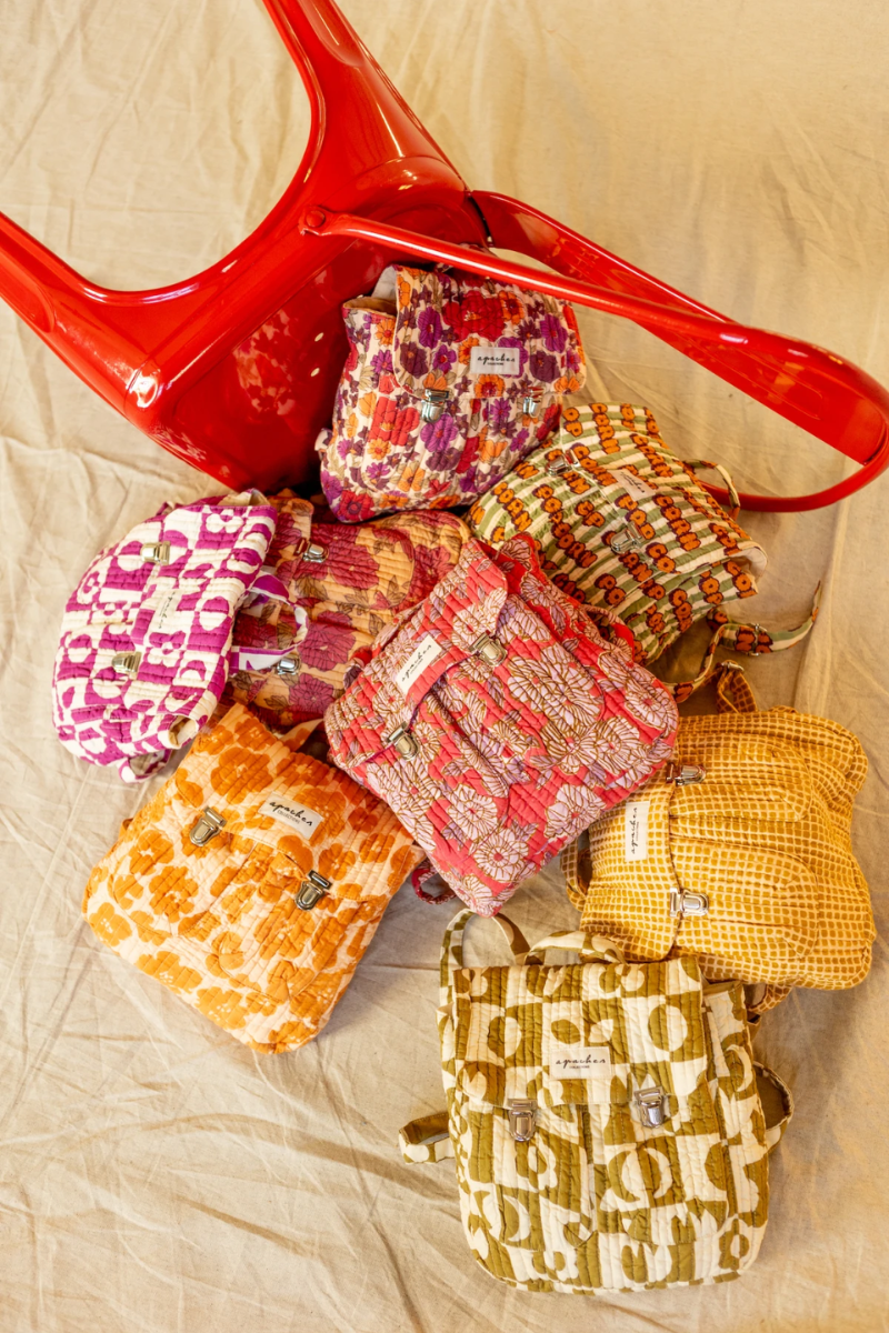 Suji ou le petit cartable idéal pour nos minis qui pourront y glisser petits livres et jouets. Tissu exclusif "Pop Corn" sublimé grâce à la technique artisanale du block print. Ses couleurs sont réalisées à partir de pigments naturels. Cette confection peut donc entraîner de légères variations et "irrégularités".