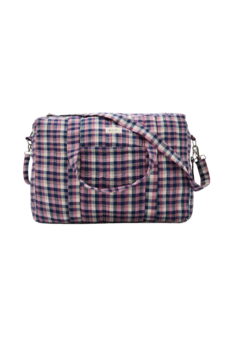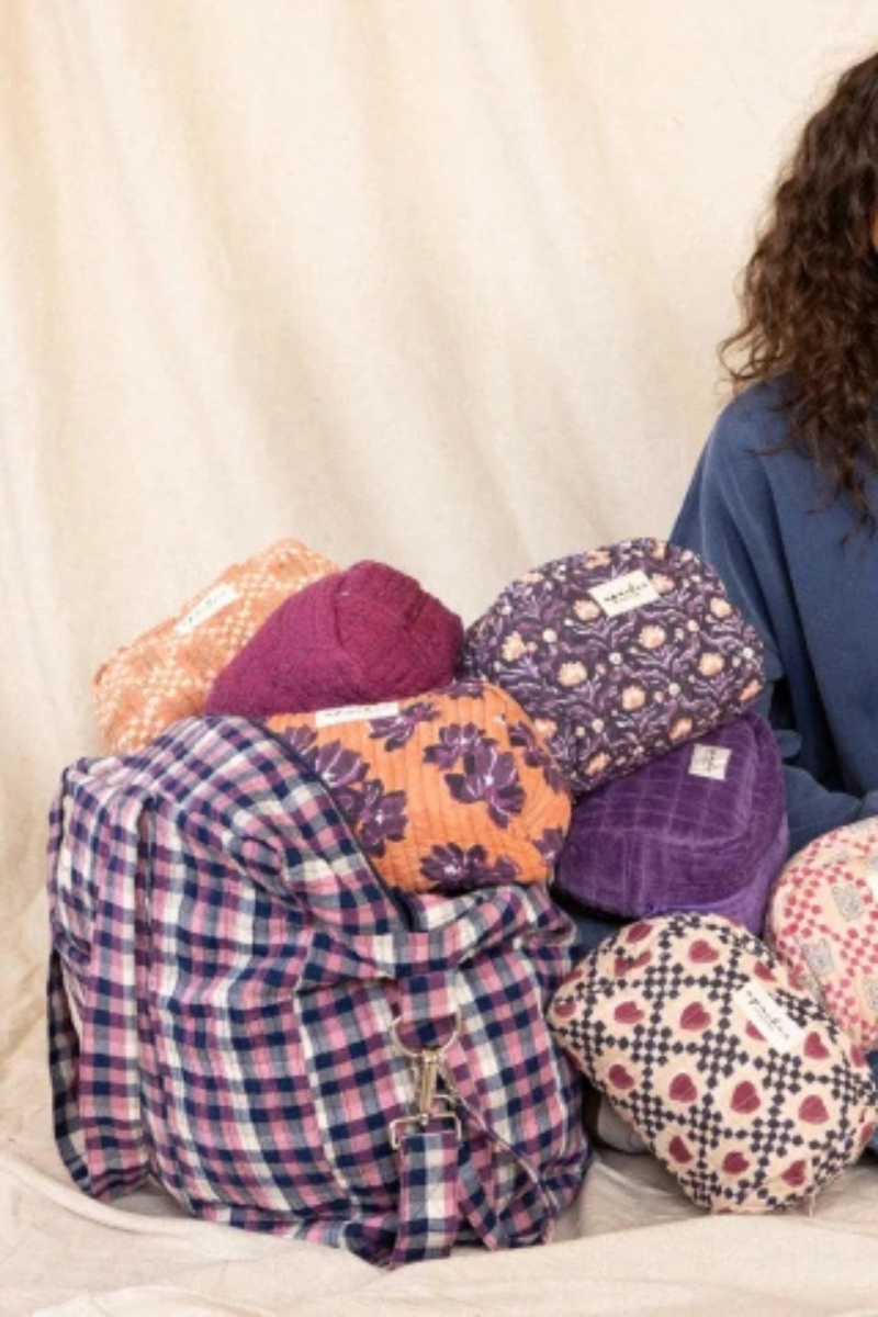 Découvrez le tout nouveau sac à langer Thaila Khadi Rose en coton imprimé matelassé. Il combine élégance et fonctionnalité et dispose de poches astucieuses et d’un mousqueton pratique.