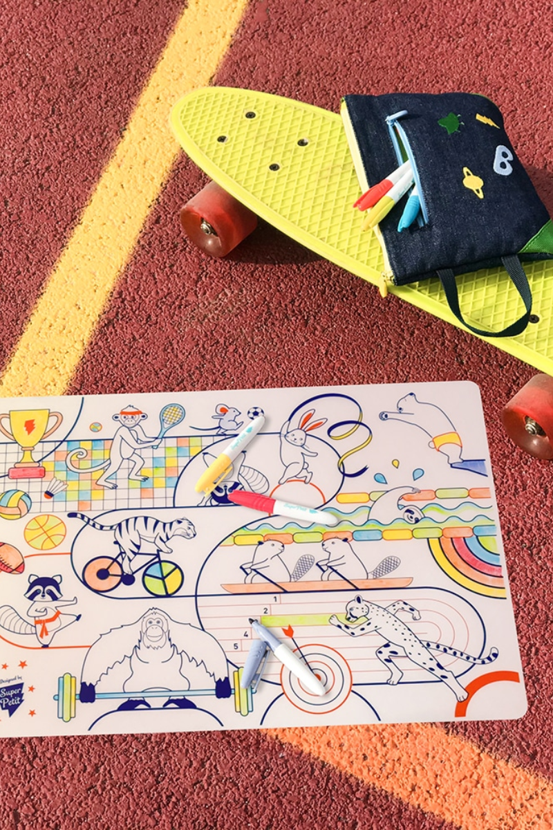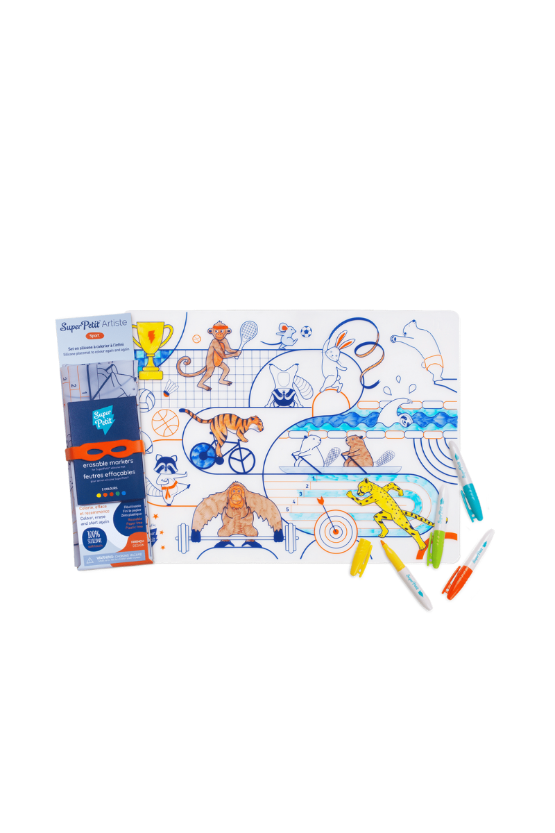 Set ludique sur le thème des sports, en silicone tout doux, à colorier à l’infini avec ses 5 feutres lavables et aux encres non toxiques. On adore le dessin créatif et rigolo qui accompagnera votre enfant à table, avec des graphismes signés SuperPetit. Ce set très facilement pliable occupera votre petit artiste dans tous ses déplacements et peut être également détourné pour des ateliers créatifs : peinture à l’eau, pâte à modeler, cuisine…