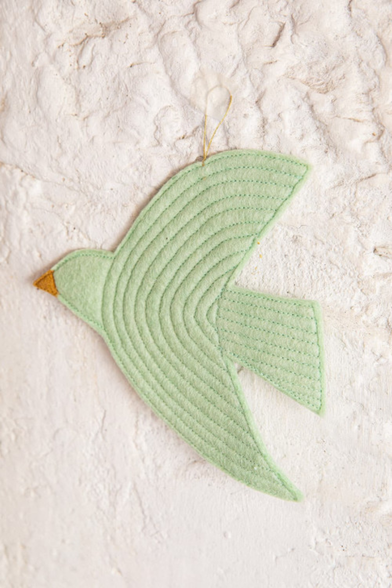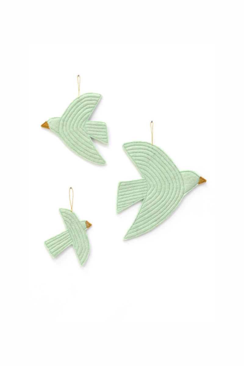 Laissez la poésie s’envoler dans votre intérieur avec ce trio d’oiseaux en feutre signé Mushkane. Déclinés dans des tons menthe doux et apaisants, ces jolis oiseaux fait à la main sont prêts à se suspendre partout où l’envie vous prend : au mur, à une poignée de meuble, au-dessus du lit ou dans un mobile à composer soi-même.