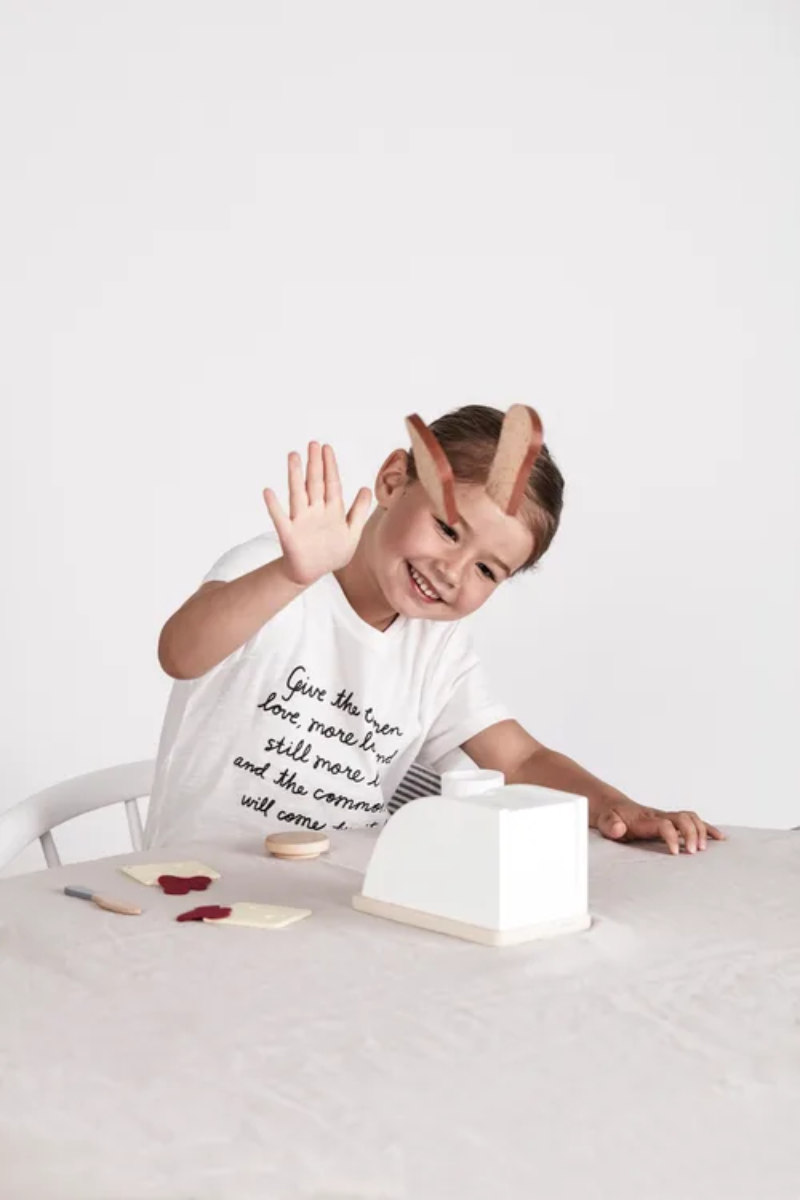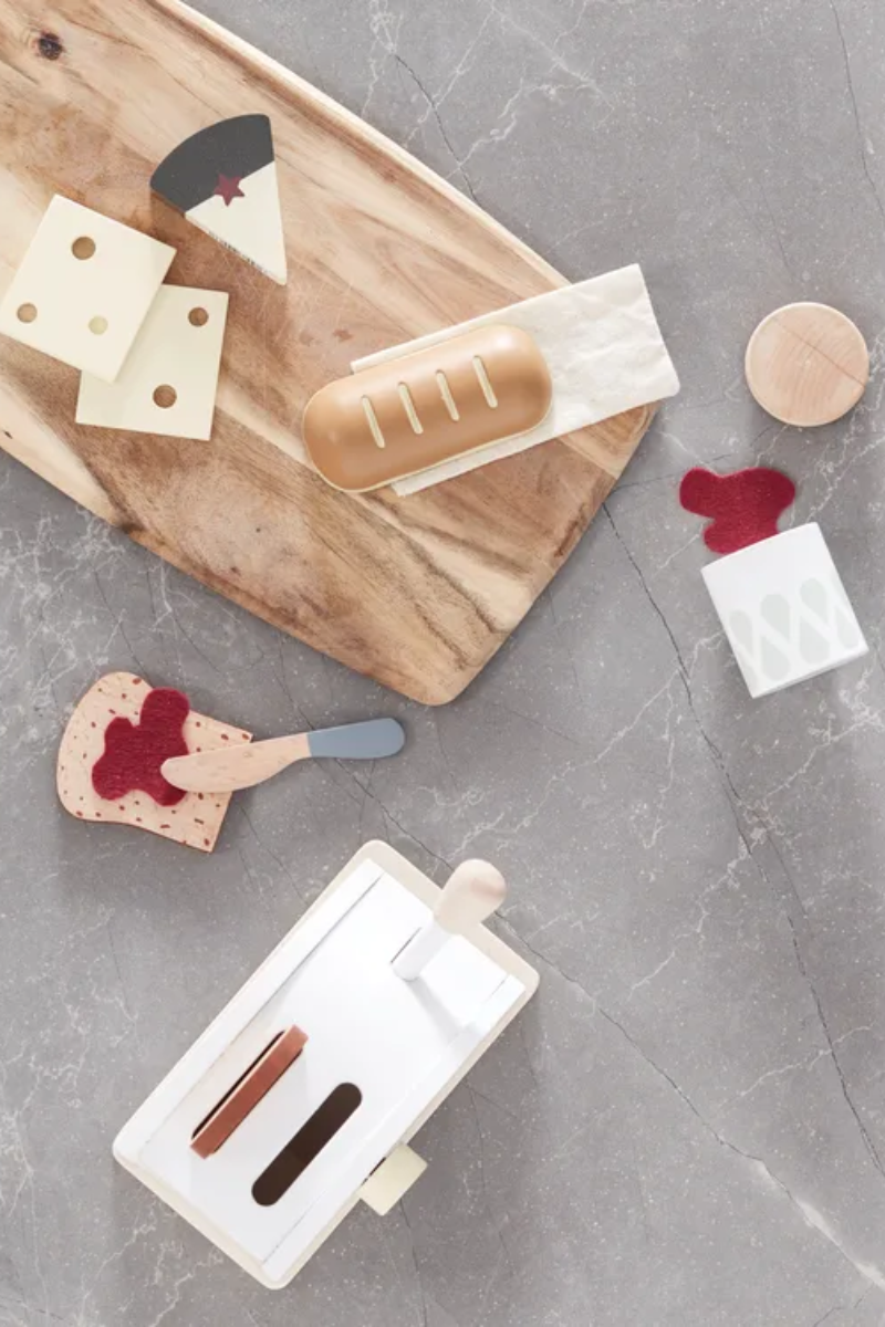 Ensemble grille-pain en bois avec 8 accessoires de chez Kid's Concept. Utilisez le levier pour faire sauter les tranches grillées et tournez la molette pour régler la chaleur.