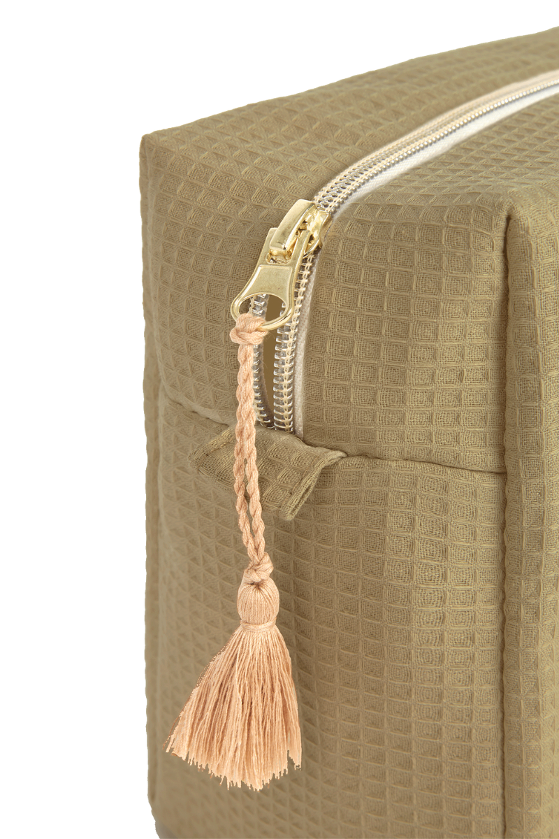 Large et pratique, la trousse de toilette Diva de chez Nobodinoz s'habille de nid d’abeille 100% en coton biologique et d'une doublure intérieure imperméable.